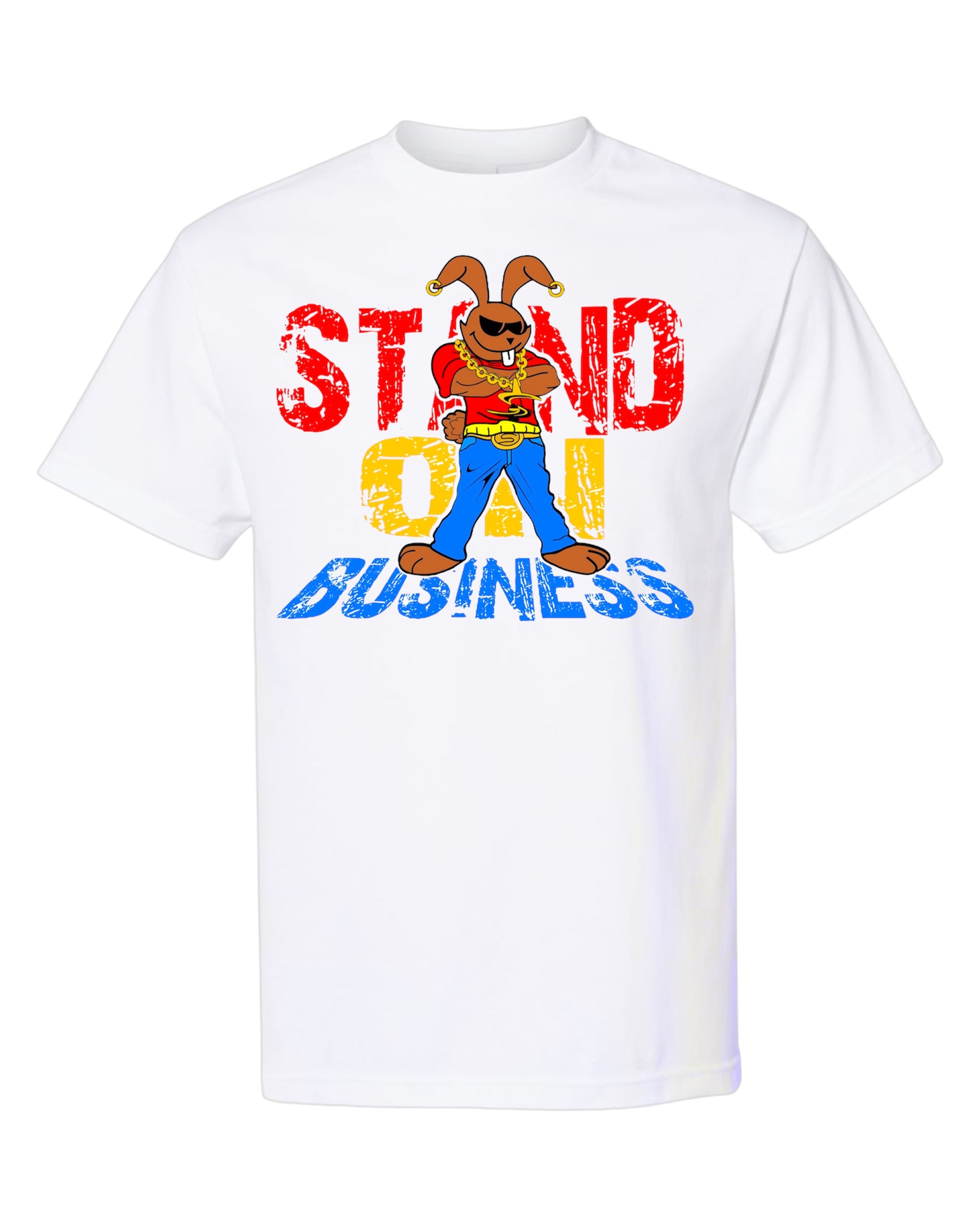 Step up and Stand On Business in style. This bold graphic tee features our fearless Boss Bunny character front and center, rocking chains and confidence, backed by powerful red, yellow, and blue distressed text. Whether you’re making moves or just making noise, this shirt makes a statement without saying a word.